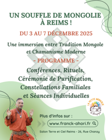 Animé par Franck, praticien en constellations depuis plus de 10 ans, avec un ancrage à la fois occidental et mongol.